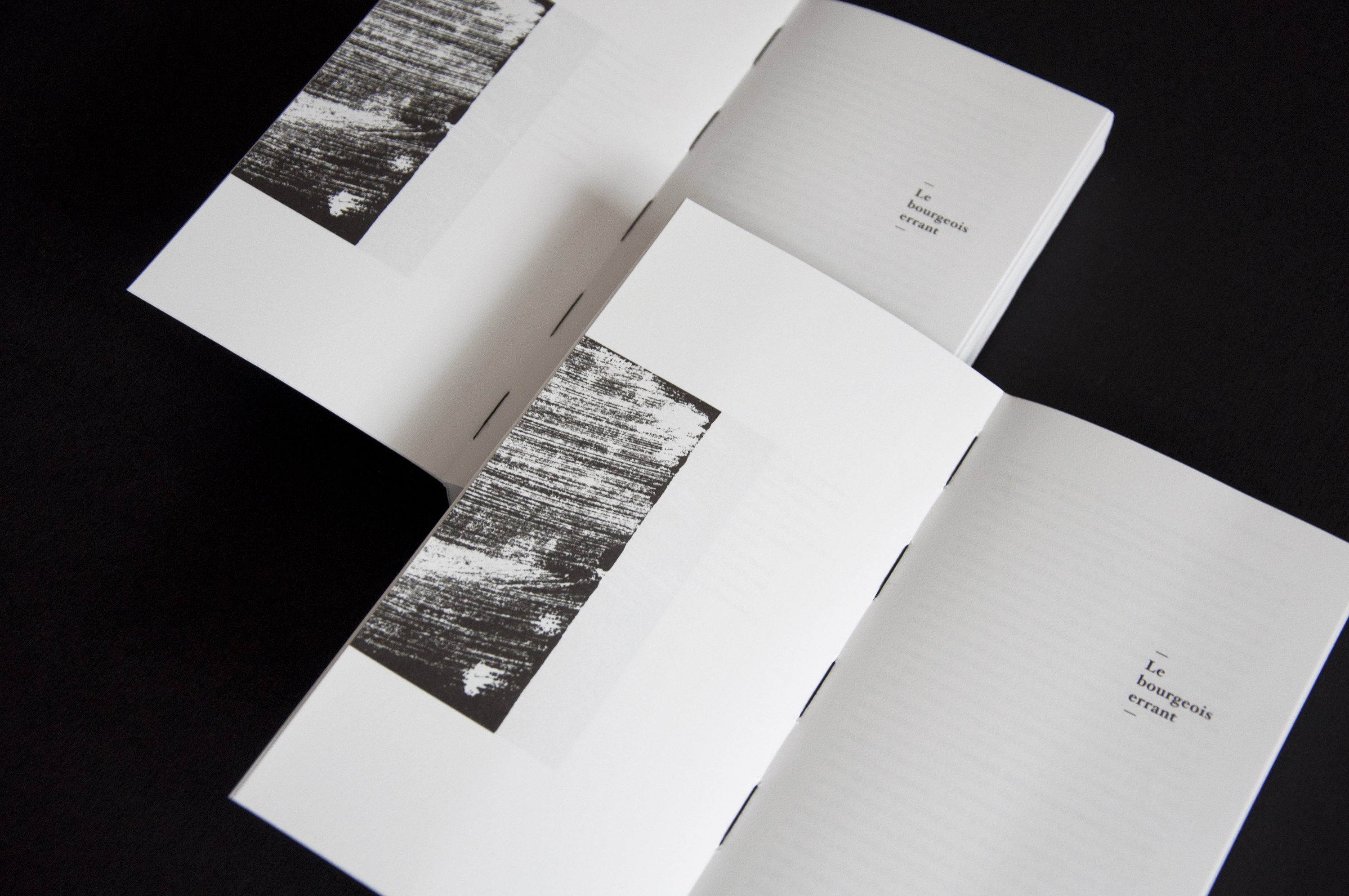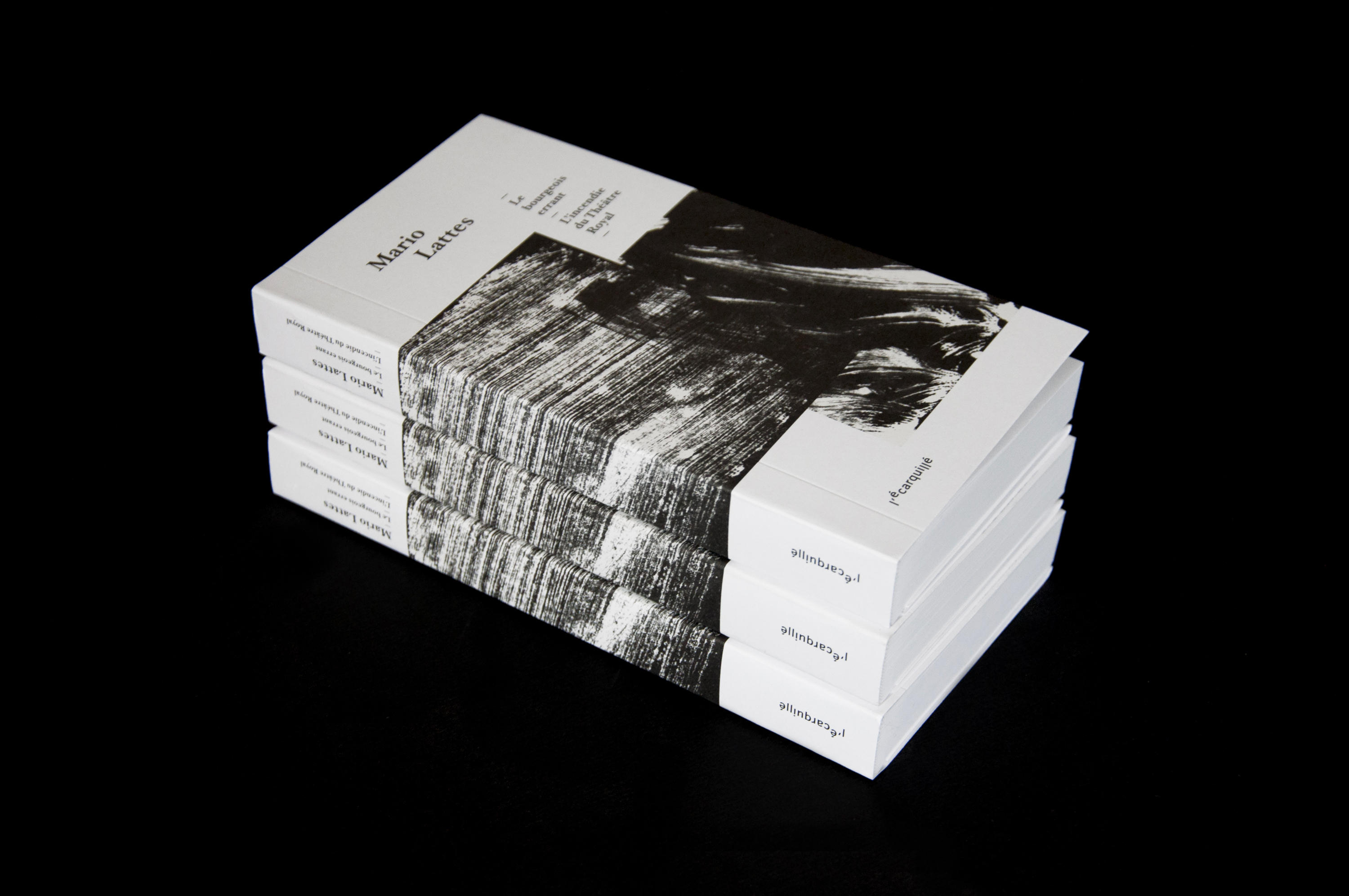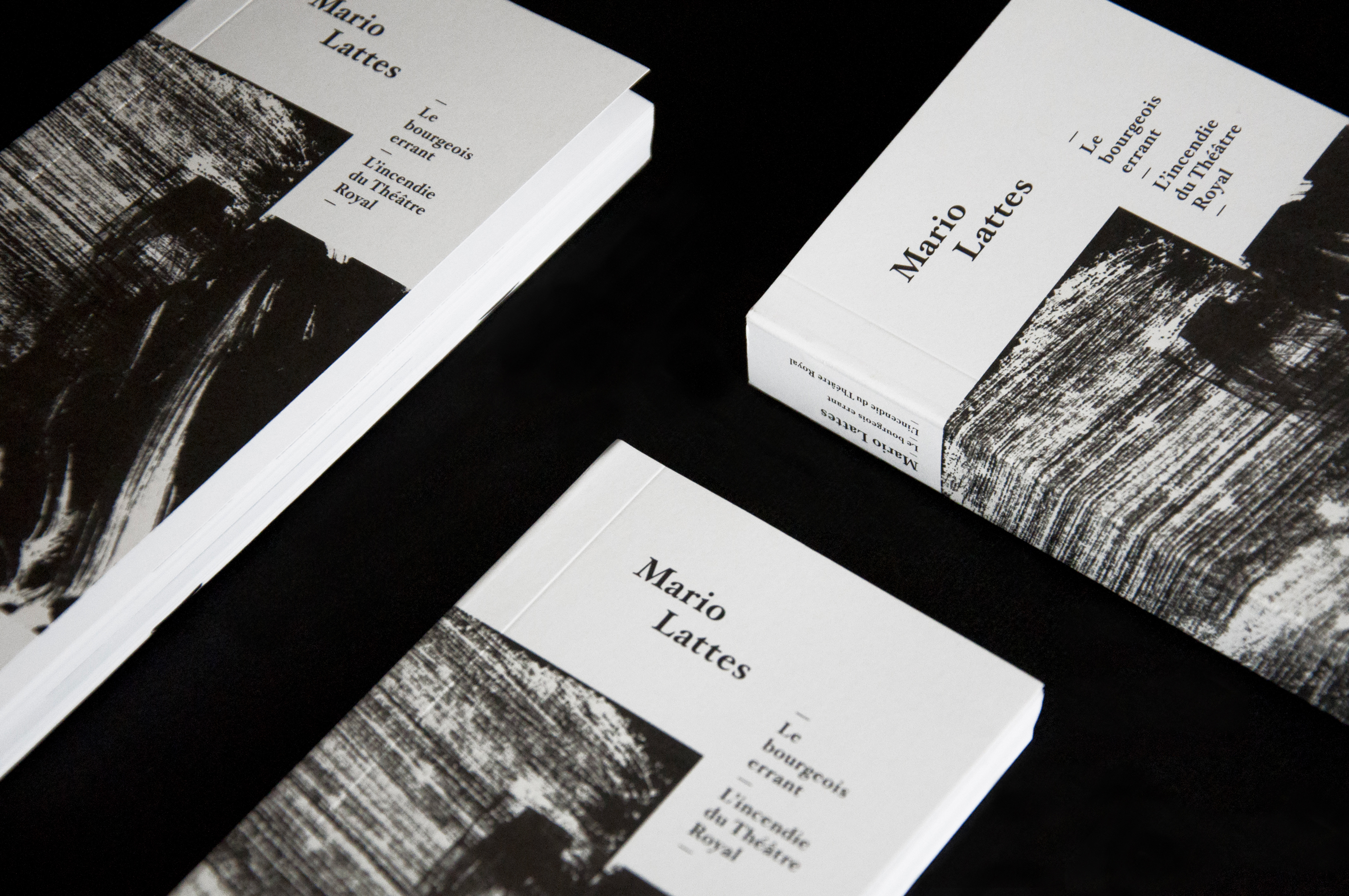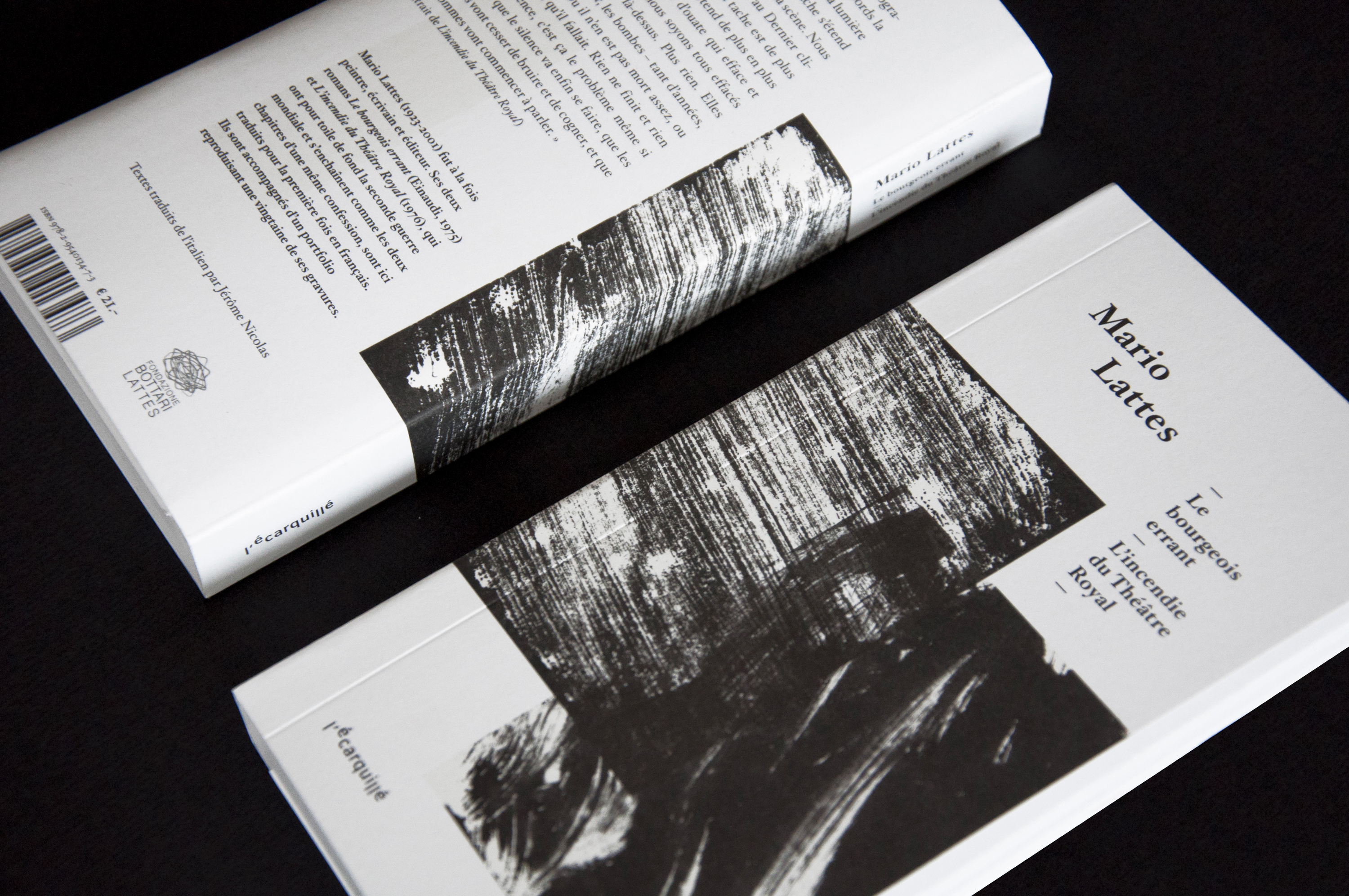 Conception de l’ouvrage « Mario Lattes ». Les deux types de mises en pages développées correspondent aux deux romans : « Le bourgeois errant » et « L’incendie du théâtre royal ». L’objet, à la reliure apparente, se déploie en trois volets, laissant le lecteur découvrir en fin d’ouvrage un portfolio d’œuvres graphiques de l’auteur.