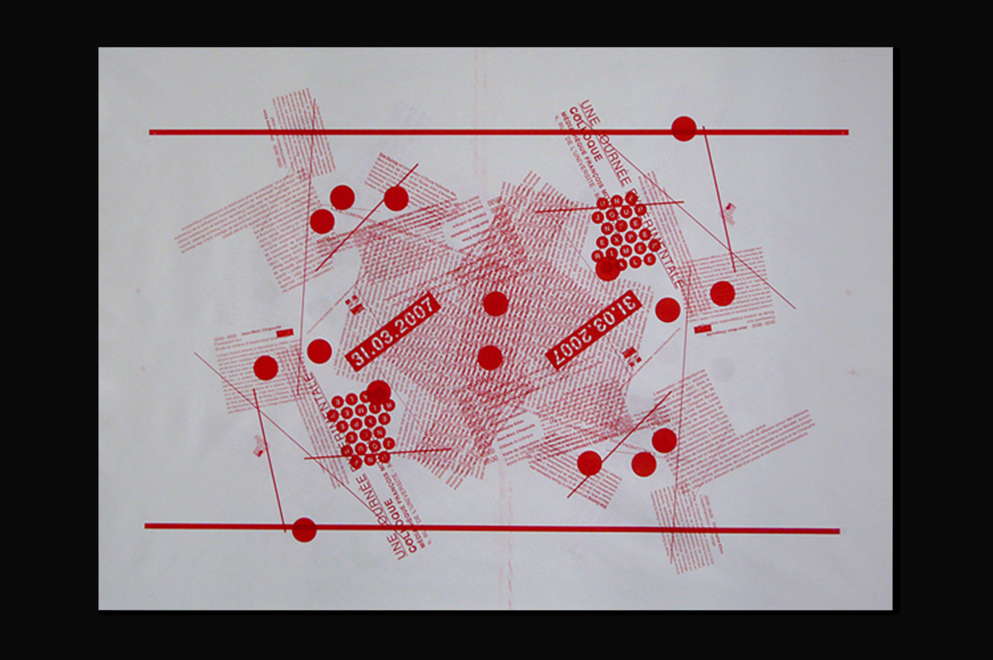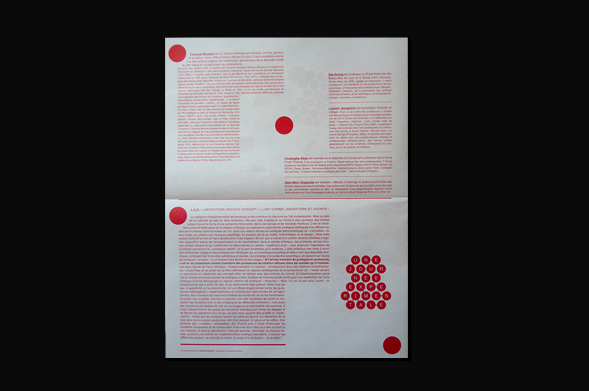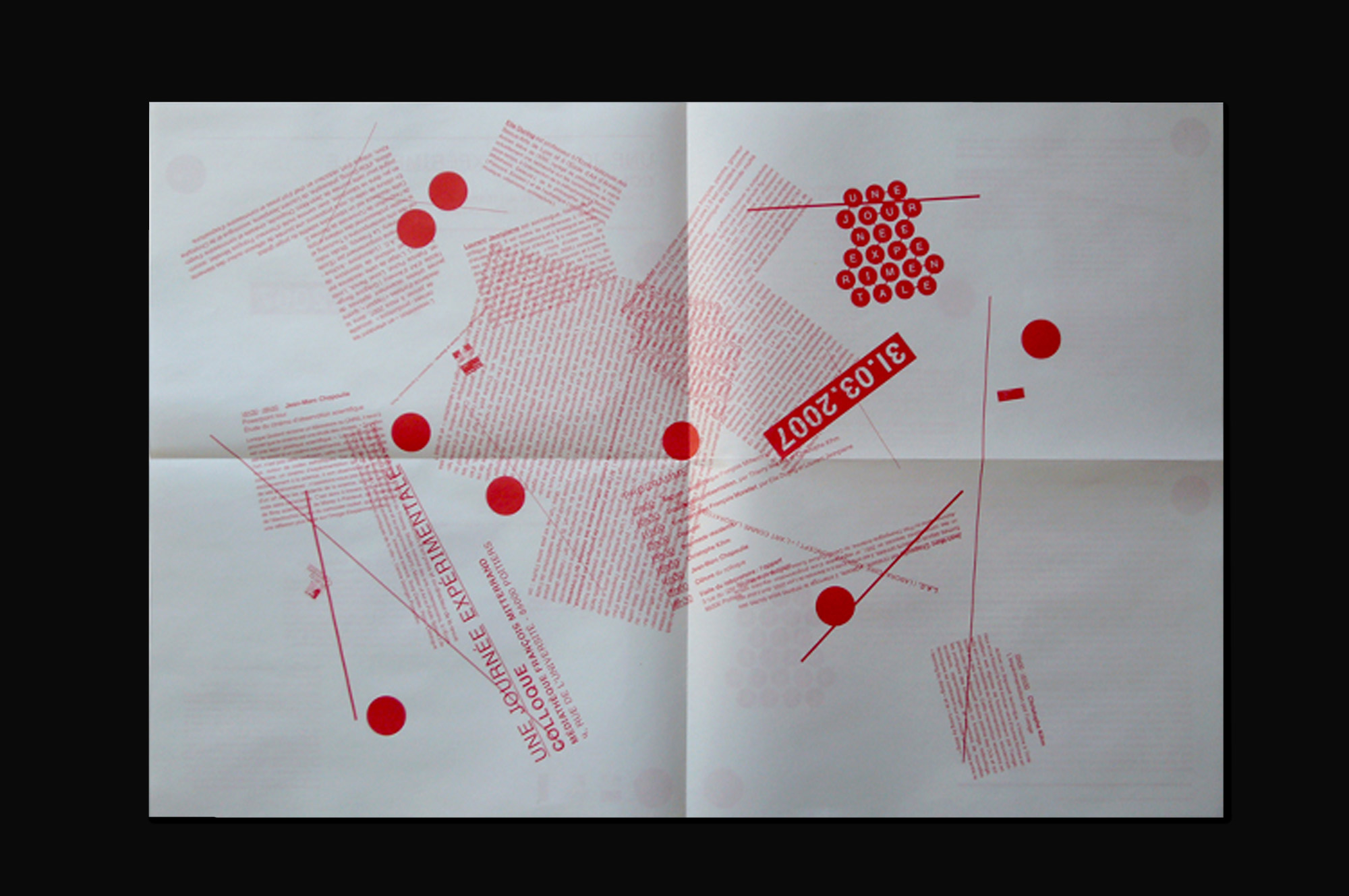 Conception du dépliant-programme d’une journée-colloque autour de l’art contemporain « une journée expérimentale ». La réalisation de ce document sérigraphié a donné lieu à de belles macules.
